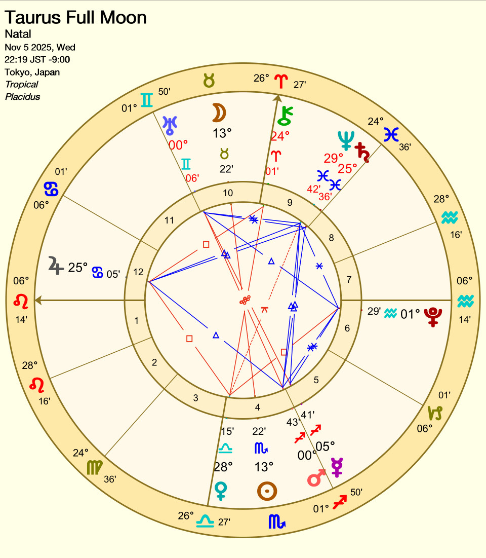 今回の満月は、4-10ハウスで迎える満月。4-10ハウスはインターセプトで、満月に関わるアスペクトはありません。