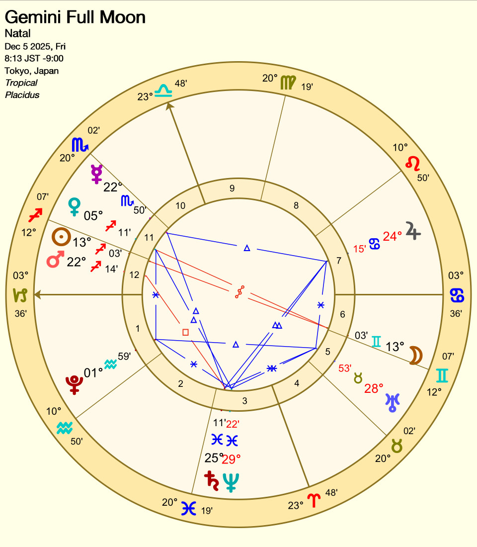 2025年12月5日8時13分双子座14度で満月を迎えます。