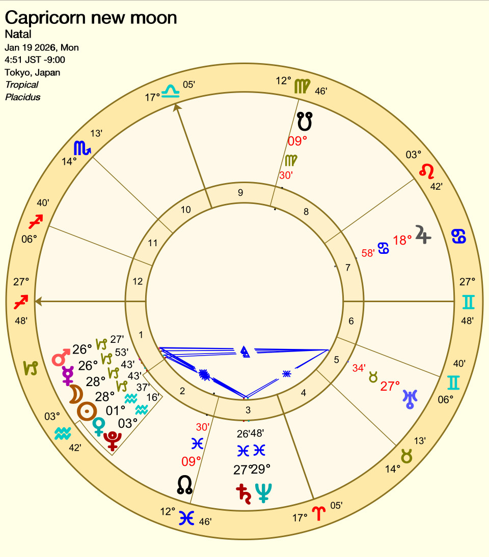 今回は1ハウスで起こる新月。新月には、山羊座の水星・火星、そしてサイン違いで水瓶座の金星・冥王星が加わり、合計6天体が密集するコンジャンクションと
