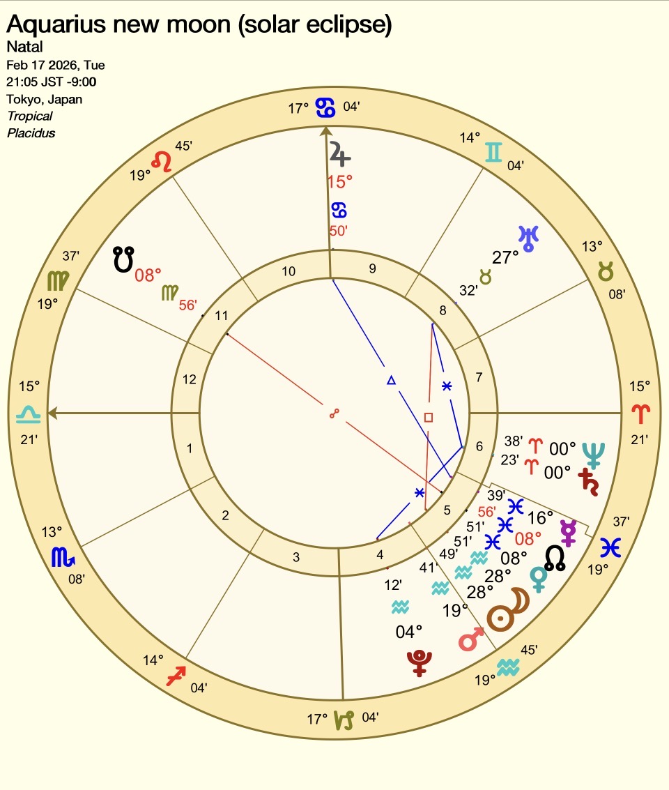東京のチャートでは、新月は5ハウスに位置し、8ハウス牡牛座天王星とタイトなスクエアを取ります。